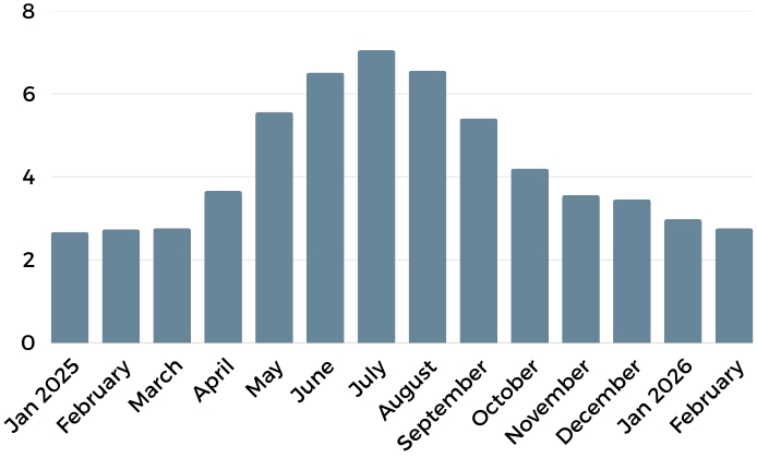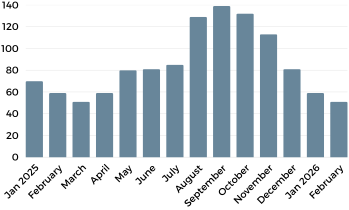At the same time, buyer engagement appears to be improving, as reflected in a meaningful shift in marketing timelines. Median days on market dropped to 47 days, down from 70 days in January and effectively identical to February of last year. This decline suggests that well-positioned homes, those priced appropriately and presented effectively, are still moving through the market at a healthy pace.