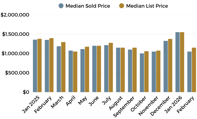 Pricing metrics require a bit more context to interpret accurately. The median sold price for February came in at $1,550,000, representing a 32% drop from January and a 22% decline compared to the same month last year. At first glance, that figure may appear dramatic; however, the shift is largely attributable to the composition of sales rather than a meaningful drop in property values. January experienced an unusually high concentration of luxury sales above $5 million, which temporarily inflated the overall median. February, by comparison, saw fewer transactions in that ultra-high-end segment. When adjusted for the mix of properties sold, values across most price tiers have remained relatively consistent with broader market expectations.