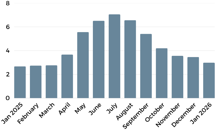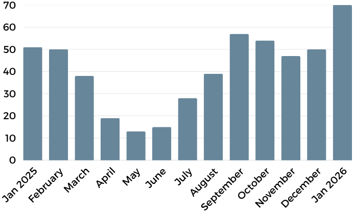 Another key metric illustrating the evolving market landscape is median days on market, which reached 70 days in January, the highest level recorded since the pandemic-driven market surge of 2020–2021. This marks a significant increase from 50 days in December and 51 days one year ago, highlighting the growing importance of strategic pricing and property positioning. Properties that enter the market correctly priced and well-presented continue to perform efficiently, while listings that miss the mark on initial pricing often experience prolonged exposure and increased negotiation pressure.