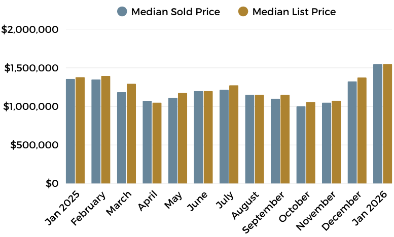 One of the most attention-grabbing metrics for January was the median sold price, which rose sharply to $1,550,000, marking a 17% increase month-over-month and year-over-year. While this increase may suggest broad appreciation across all property segments, the underlying data tells a more nuanced story. January experienced several high-profile eight-figure luxury closings, paired with a noticeable absence of transactions under the $1 million price point. This concentration of upper-tier sales artificially elevated the median price and does not necessarily reflect uniform price growth across the entire market spectrum. In reality, entry-level and mid-tier properties continue to experience measured demand with pricing sensitivity remaining a key factor in transaction success.